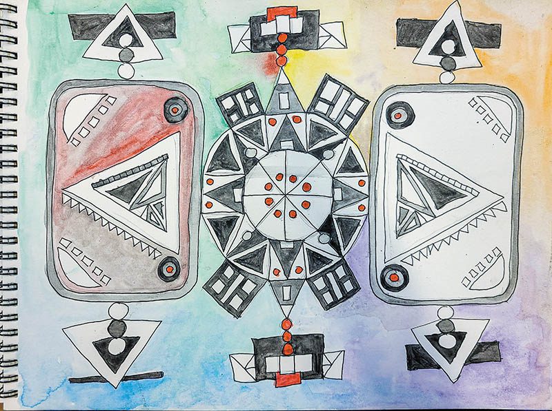 Despite a connection to nature and the spiritual world being the heartbeat of her own work, Drozda encourages these students—Adams, Amy, Chelle, Jaii, Krista, Mary, Nathanael, and Sara—to “mine new fields of ideas and inspiration.” And this she does in her uniquely encouraging, supportive and non-threatening way, reminding participants, “We are all artists when we are here.” But, they are artists who occasionally need gently reminders to reach around to the nape of their necks and turn off their “inner critic switch.”