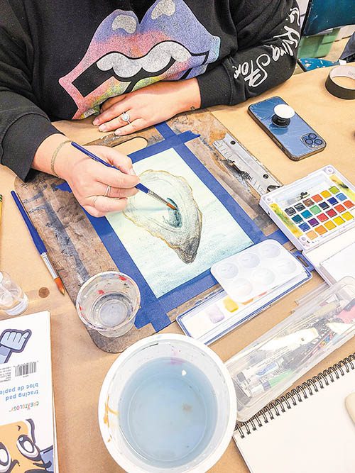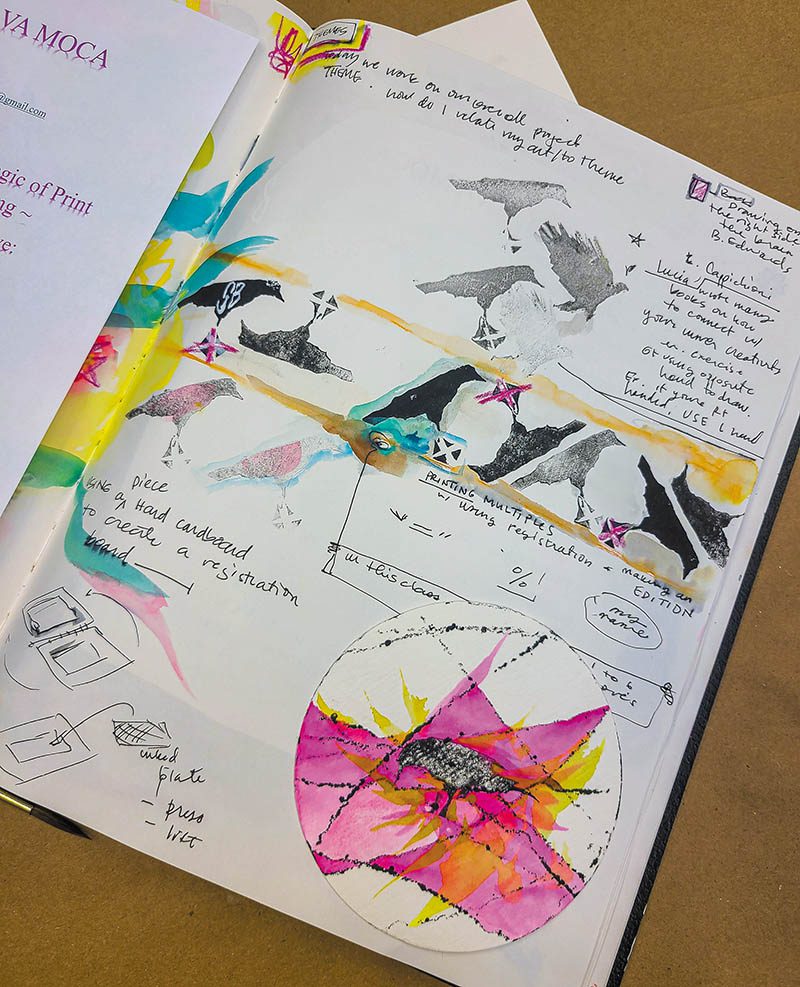 Meeting in the studios of MOCA-VA with Drozda, an instructor who provides “banks for their rivers” or freedom within structure, while emphasizing the importance of carving out a place to create, each student’s personal workspace reads like a combination of mood board, personal archive and archaeological dig. Layered in a casually organized and enticing array around each participant were rich color studies, notes and practice pages in sketchbooks, handouts and books, pens and brushes, tape, paper towels and spray bottles of water plus mouthwatering and vibrant water-soluble art materials.