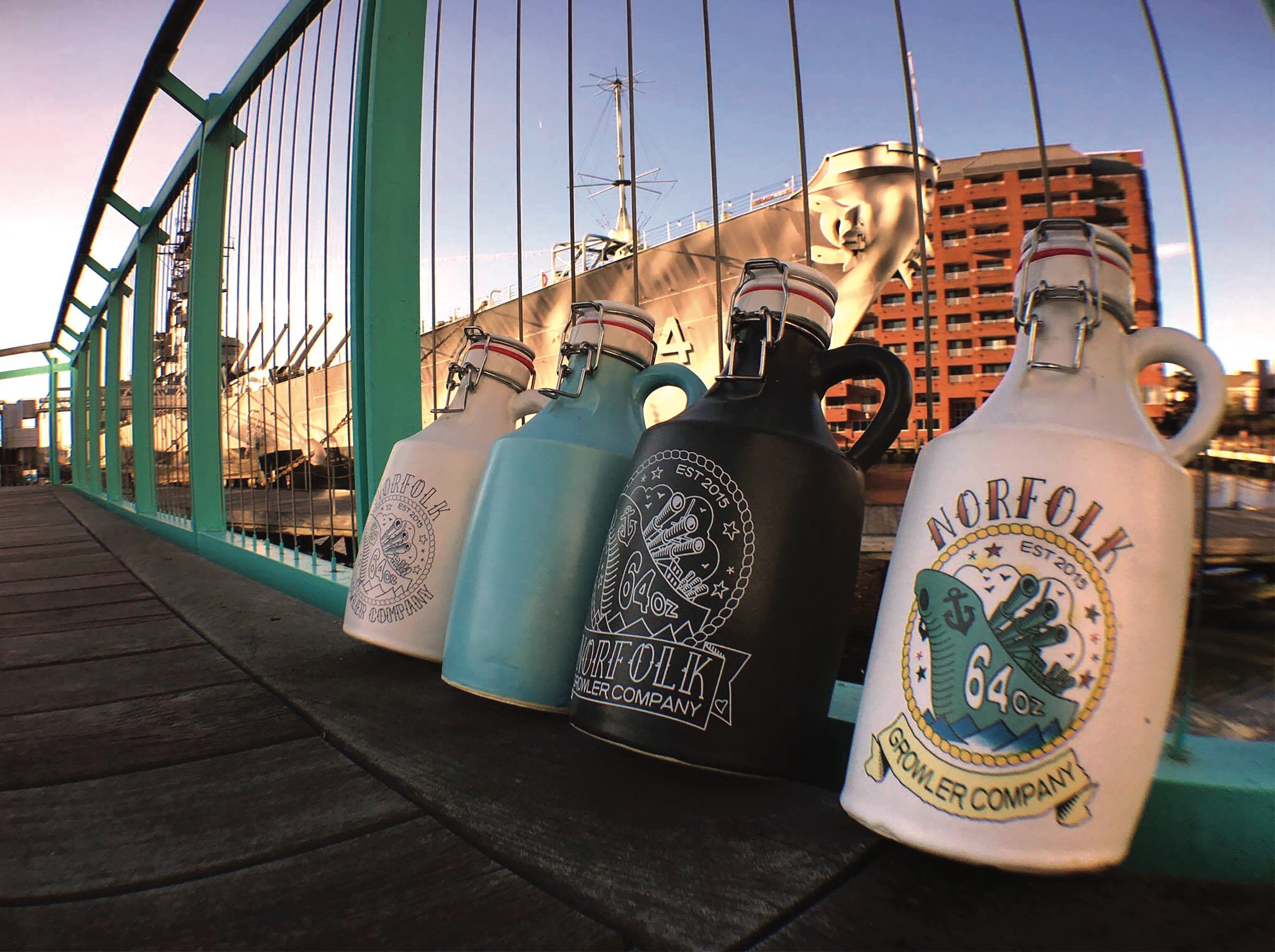 Norfolk Growler Company’s handmade craft growlers for craft beer resemble old fashioned, folksy liquor jugs, donning decals with sketched caricatures evoking the city’s lore of flowery mermaids and tattooed sailors. The company’s logo is a salute to the USS Wisconsin, where the battleship’s hull number 64 playfully designates the number of ounces that can be held within the ceramic vessel.