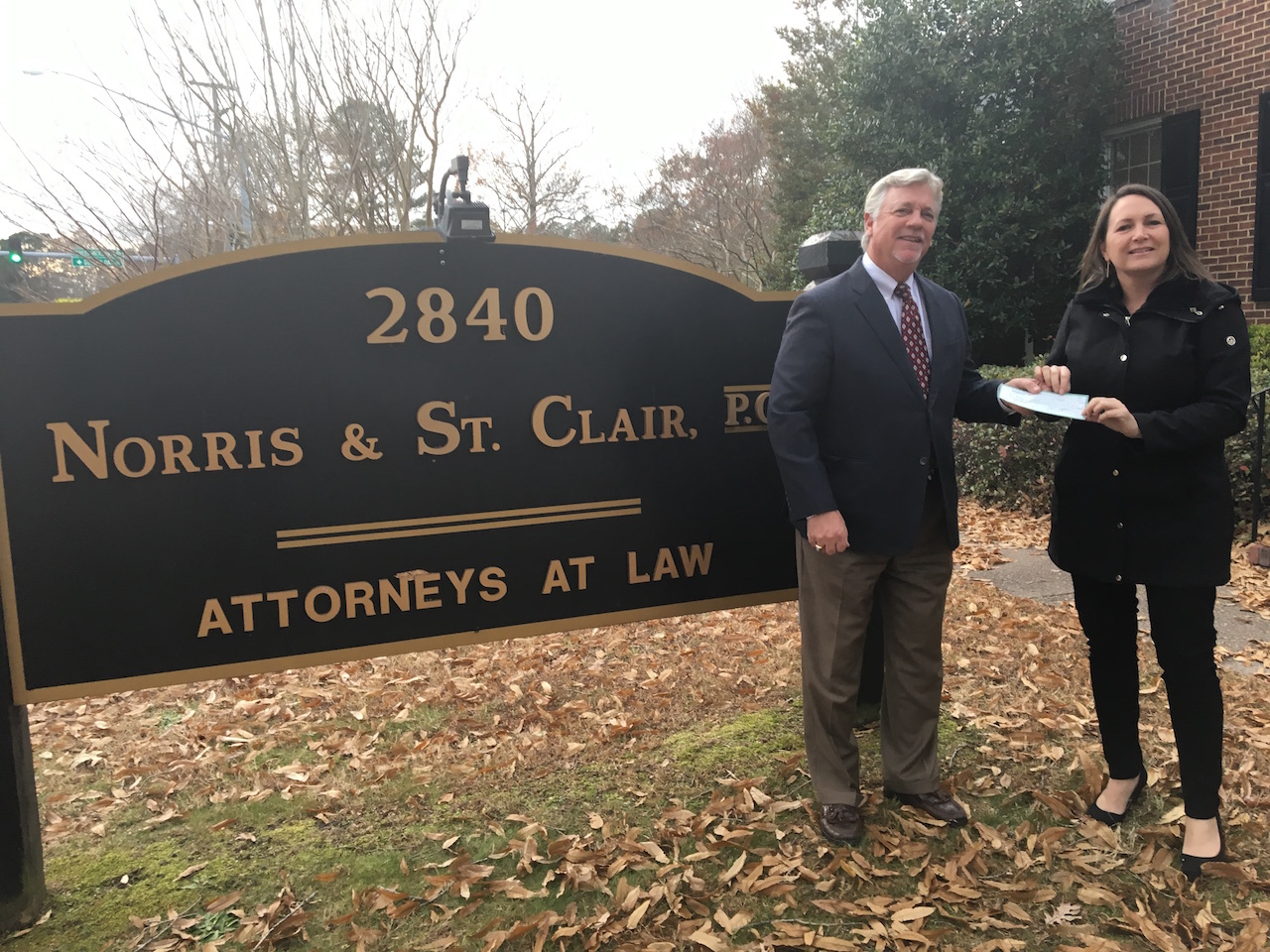 John S. Norris, Jr., president of the Virginia Beach law firm Norris & St. Clair, presents a check in the amount of $3,000 from the Virginia Beach Youth Service Club to Julie Angilly, vice president of development and communications for An Achievable Dream.